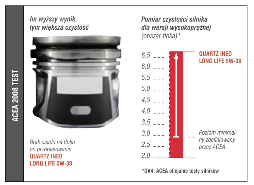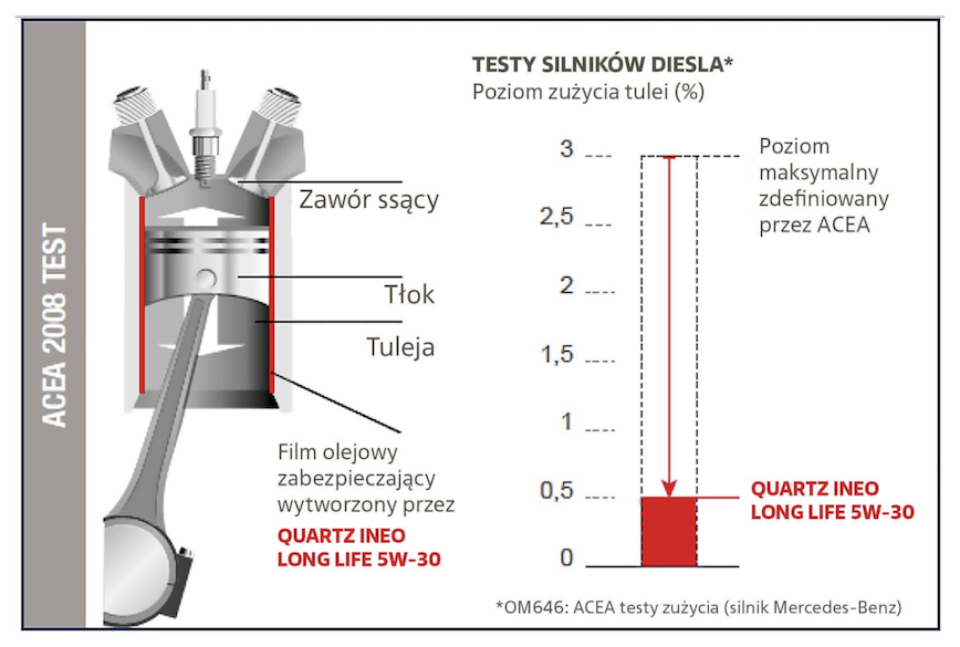 Podczas testów ACEA, jednym z badań jest tzw. test polerowania tulei cylindrowej, który sprawdza skuteczność oleju pod kątem ochrony tulei cylindrowych, a co za tym idzie, zdolność oleju do utrzymywania się na powierzchniach trących tuleja-pierścienie. W tym konkretnym przypadku był on przeprowadzony na silniku Mercedesa OM646 i wykazał 6-krotnie (!) lepszy wynik TotalEnergies, niż maksymalna wartość dopuszczona przez organizację ACEA! Jest to bardzo istotny test pokazujący zdolność zabezpieczenia tulei przed zużyciem, ścieraniem specjalnego honowania. Jest ono bardzo istotne, aby olej utrzymał filmu smarującego pomiędzy pierścieniami, a tuleją. Należy przypomnieć, że olej może osiągać temperaturę 250OC w tych miejscach i jego lepkość spada do bardzo niskich wartości.