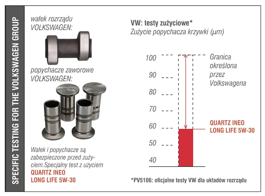 Kolejne istotne badanie udostępnione przez TotalEnergies przeprowadzone przez firmę Volkswagen dotyczyło przydatności oleju do ochrony krzywek i popychaczy. Tym razem okazało się, że Quartz Ineo Long Life 5W-30 chroni krzywki i popychacze aż o 40% lepiej, niż wymaga tego niemiecki producent. Jest to niezwykle wymagający test, ponieważ w tym obszarze panują bardzo wysokie naciski (80-100 kg/cm2), a olej rozgrzany do temperatury 120-180oC musi wytworzyć odpowiedni film olejowy – warstwę graniczną, aby przeciwdziałać tym obciążeniom.