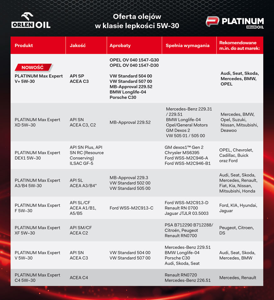 Firma ORLEN OIL, świadoma tego, jak ważne jest reagowanie na zmieniające się wymagania i trendy rynku, konsekwentnie wdraża nowe technologie i rozwiązania. W odpowiedzi na zapotrzebowanie oferta produktowa ORLEN OIL została wzbogacona o nowy olej silnikowy Platinum Max Expert V+ 5W-30 w klasie jakości API SP i ACEA C3. Ma on oficjalną homologację do stosowania w silnikach najnowszej generacji: koncernu Stellantis, Volkswagen Group, Mercedes-Benz Group AG, BMW Group, spełniających normy emisji spalin Euro 6d. Jest to w pełni syntetyczny olej typu mid SAPS, jego stosowanie pozwala na maksymalne wykorzystanie jednostki napędowej. W najwyższym możliwym stopniu chroni silnik przed niekorzystnym wpływem LSPI, zapewniając ponadto wyjątkowy spadek oporów tarcia, co gwarantuje uzyskanie doskonałych parametrów oszczędności paliwa. Tworzy trwały film olejowy, chroniący wszystkie elementy silnika, dzięki czemu doskonale sprawdza się zarówno w ruchu miejskim przy częstych uruchomieniach i wygaszaniu silnika, jak i podczas dynamicznej, szybkiej jazdy na drogach szybkiego ruchu.