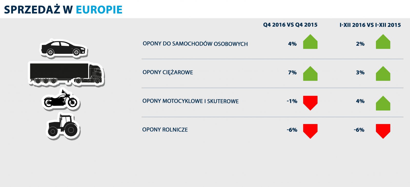 Rosnąca sprzedaż jest również widoczna w oponach ciężarowych – plus 7 proc. w porównaniu kwartalnym (ostatni kwartał 2016 do 2015 roku) oraz plus 3 proc. w skali roku. To czwarty rok z rzędu, kiedy sprzedaż roczna w tej kategorii jest rosnąca.