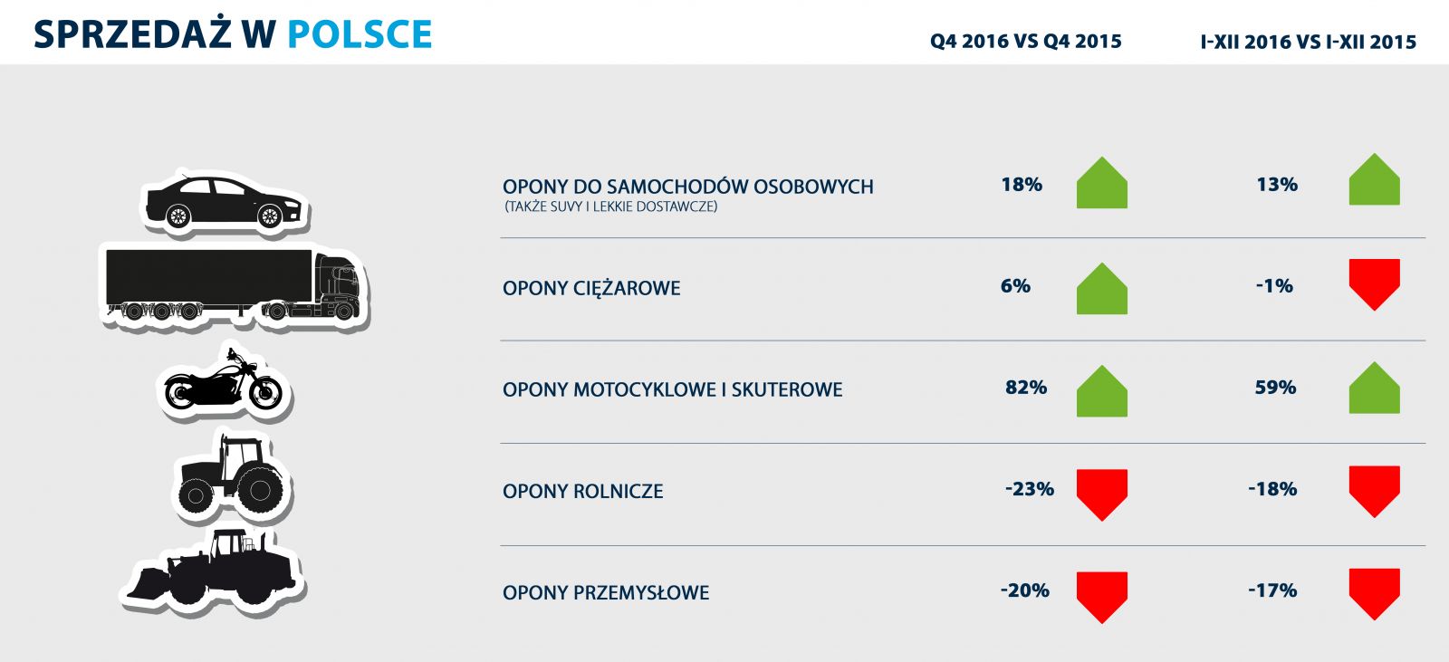 Podsumowanie sprzedaży opon w Polsce w roku 2016 wygląda obiecująco. W kategorii opon do samochodów osobowych, w tym suv i lekkich dostawczych, wzrost sprzedaży w skali całego roku wyniósł aż 13 proc. Także porównując IV kwartał 2016 roku do 2015 wzrost osiągnął imponujące 18 proc. Pozytywnym trendem jest także rosnąca sprzedaż opon segmentu premium – 14 proc. w skali roku. Z kolei sprzedaż opon klasy średniej wzrosła o 7 proc, a sprzedaż najtańszych opon budżetowych o 1 proc. Szczególnie wysokie wzrosty można było zauważyć w segmencie samochodów typu SUV gdzie wzrost roczny wyniósł 20 proc., natomiast w pojazdach typu van i lekkich dostawczych solidne 11 proc.