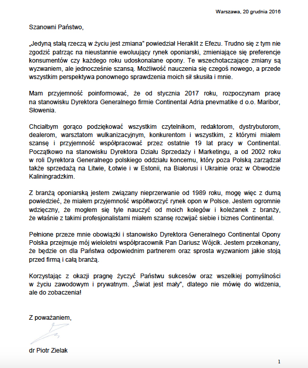 Styczeń 2017 to zmiany w Continental Opony Polska. Dr Piotr Zielak, który nieprzerwanie od 1989 roku jest związany z branżą oponiarską, rozpocznie pracę na stanowisku Dyrektora Generalnego firmy Continental Adria pnevmatike d o.o. Maribor w Słowenii. Continental Opony Polska poprowadzi Dariusz Wójcik.