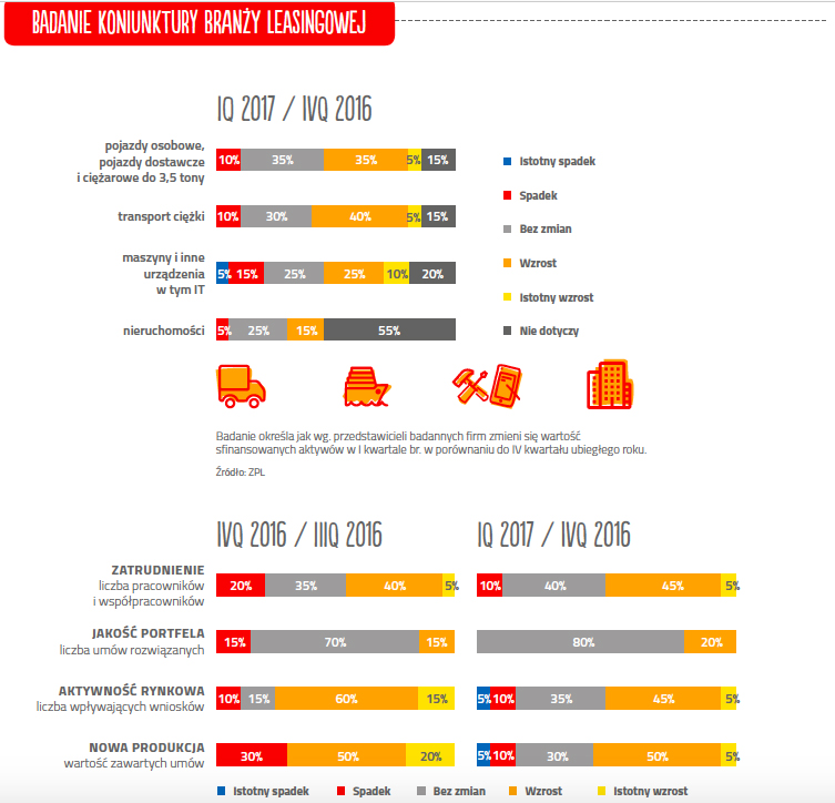 Na koniec 2016r. łączna wartość aktywnego portfela branży leasingowej w kwocie 105,1 mld zł (97,8 mld zł dla ruchomości i 7,3 mld zł dla nieruchomości) była porównywalna z wartością salda kredytów inwestycyjnych udzielonych firmom przez banki (114,5 mld zł, wg. stanu na koniec 2016). Leasing to wciąż główne, obok kredytu, zewnętrzne źródło finansowania inwestycji pracujących w gospodarce.