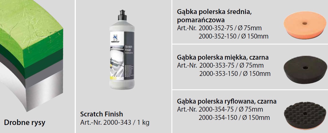 Do usuwania głębokich, silnych zarysowań polecamy następujące materiały: scratch Off Ultra, pasta polerska gruba, futro polerskie, żołta gąbka polerska albo niebieska gąbka Spider