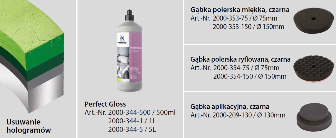 Do polerowania na wysoki połysk polecamy następujące materiały: Perfect Gloss, Politura wysokopołyskowa, czarne gąbki
