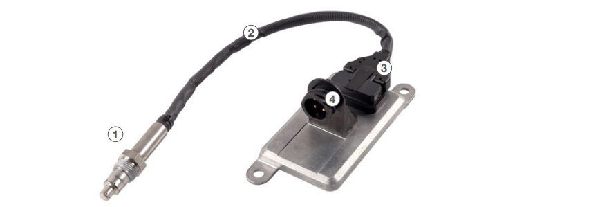 Czujnik NOx zbudowany jest z sondy (1), przewodu łączącego (2), modułu sterującego (3) oraz wtyczki przyłączeniowej (4).