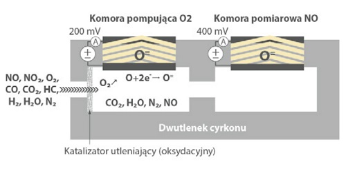 Spaliny wpływają do pierwszej komory, gdzie tlen O₂ usuwany jest elektrochemicznie. Jest to konieczne, ponieważ w przeciwnym razie pomiar tlenku azotu w drugiej komorze zostałby zakłócony. Przy pomocy napięcia elektrycznego podawanego do komory pompującej cząsteczki O₂ rozbijane są na jony. Te z kolei przenikają do stałego elektrolitu składającego się z dwutlenku cyrkonu i w ten sposób są usuwane z komory pomiarowej. Energia elektryczna, która musi zostać użyta do tego celu, jest odwrotnie proporcjonalna do stosunku powietrza do paliwa. Wartość ta jest również przesyłana do sterownika silnika, który nadzoruje pracę sondy lambda mierzącej zawartość tlenu w spalinach.