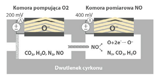 Aktualnie stosowana technologia pomiaru NOx oparta jest na czujnikach elektrochemicznych zawierających stabilizowany itrem dwutlenek cyrkonu ZrO₂. Konstrukcja i sposób działania tych czujników są podobne do szerokopasmowych sond lambda. Czujniki te wykorzystują zazwyczaj dwie sąsiadujące ze sobą komory pomiarowe z dwoma komorami elektrochemicznymi, zwanymi również komorami pompującymi.