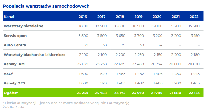 W Polsce istnieją 22 123 aktywne warsztaty samochodowe, z czego ponad 93% stanowią niezależne serwisy. Zgodnie z danymi udostępnianymi przez GiPA, w latach 2016– 2022 łączna liczba warsztatów samochodowych w naszym kraju zmniejszyła się z 25 239 do 22 123.
