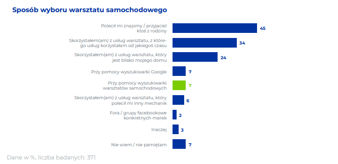 Przy wyborze serwisu, ważną rolę odgrywają polecenia. W pierwszej kolejności rozważane są punkty doceniane przez znajomych czy przyjaciół. Potwierdziły to odpowiedzi 45% respondentów. Na znaczeniu zyskują też wyszukiwarki serwisowe, np. Motointegrator.com.
