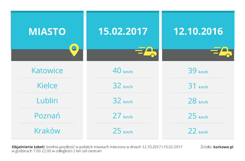 Pomiarów dokonywano 15 lutego w godzinach 7.00-22.00, gdyż tego dnia poziom szkodliwych pyłów w wielu miejscach kraju przekroczony był kilkakrotnie. Za punkt odniesienia wzięto środę zeszłej jesieni (12.10.2016), kiedy jakość powietrza była zdecydowanie lepsza. Czy prędkość zwiększyła się przez to, że kierowcy przesiedli się w komunikację miejską?