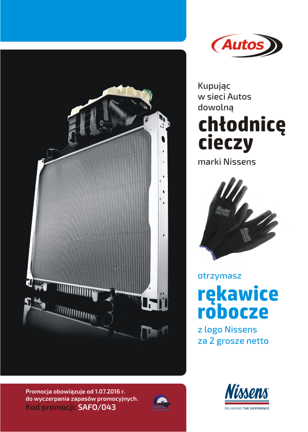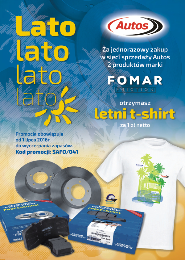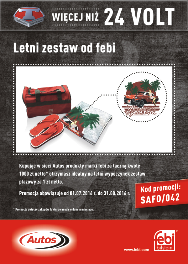Liczne promocje dla swoich klientów przygotowała firma Autos. Przy zakupie produktów marki febi za kwotę 1000 złotych netto klienci otrzymają zestaw plażowy za symboliczną złotówkę. Za każdorazowy zakup w sieci sprzedaży Autos dwóch produktów marki Fomar firma podarowuje letni t-shirt, również za symboliczną złotówkę. Natomiast przy zakupie dowolnej chłodnicy cieczy marki Nissens za dwa grosze netto można otrzymać rękawice robocze z logo Nissens. Szczegóły na plakatach poniżej.