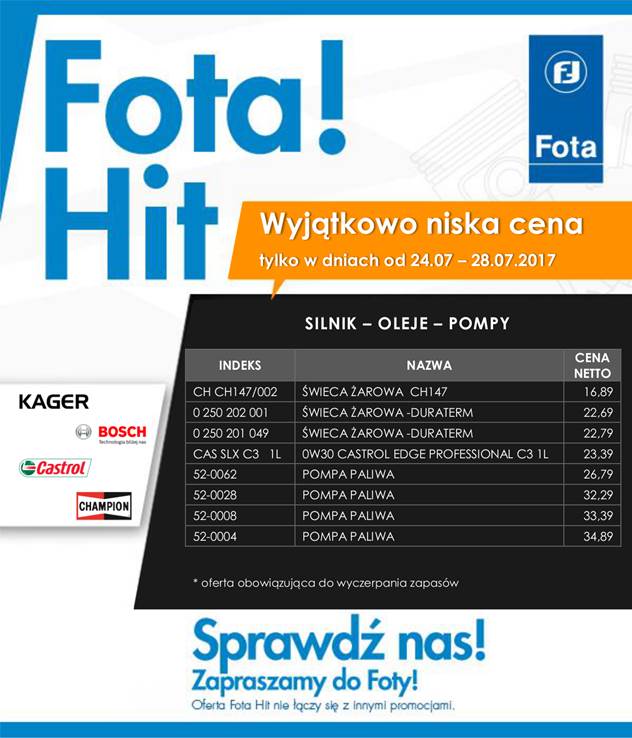 Fota poinformowała o kolejnej już promocja. W dniach 24-28 lipca obowiązują niższe ceny na świece żarowe, olej oraz pompy paliwa. Szczegóły na www.fota.pl.