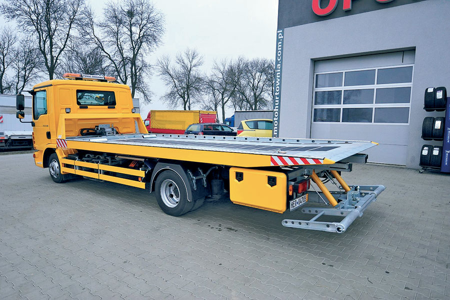 - pojazd z platformą najazdową (ang. rollback) – za pomocą wyciągarki samochód, który należy usunąć, wciągany jest całkowicie na platformę ładunkową tego pojazdu, co ułatwia możliwość hydraulicznego wysuwania platformy najazdowej tego pojazdu.