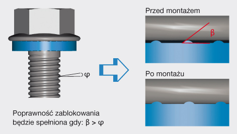Kąt nachylenia żeber jest większy niż skok gwintu śruby. Wskutek czego w połączeniu zarówno podkładki jak i śruby i nakrętki osiągamy wspaniałe połączenie a tym samym doskonały efekt blokujący.