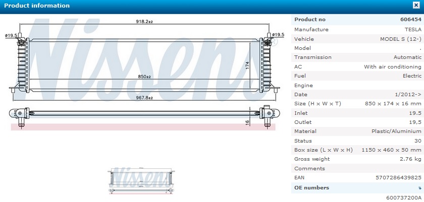 Uprzejmie informujemy, że Nissens wprowadził do oferty hurtowej chłodnicę cieczy do modelu TESLA S, nr OE 600737200A, ref. Nissens 606454. Jest to główny wymiennik ciepła „ciecz-powietrze”, znajdujący się na przedzie auta. Chłodnica dostępna jest w magazynach Nissens w Danii oraz w Polsce.