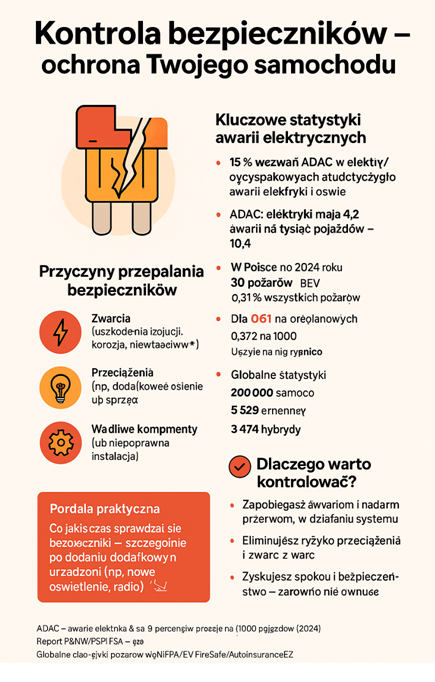 Powyższa infografika przedstawia kluczowe statystyki dotyczące awarii elektrycznych w pojazdach. Obrazek szczegółowo wyjaśnia główne przyczyny przepalania bezpieczników: zwarcia (uszkodzenia powodujące korozję, niewłaściwe połączenia), przeciążenia (np. dodatkowe oświetlenie lub nieprawidłowy sprzęt) oraz wadliwe komponenty (np. niepoprawna instalacja).