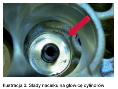 - Ślady nierównomiernego nacisku na powierzchni przylegania sprężyny zaworu w głowicy cylindrów (patrz Ilustracja 3).