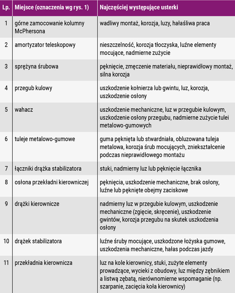 Na rys. 1 zaznaczono miejsca w układach zawieszenia i kierowniczym, na które należy zwrócić szczególną uwagę podczas oględzin zewnętrznych. Natomiast w tabeli 1 wymieniono niektóre powszechnie występujące usterki w newralgicznych miejscach tych układów.