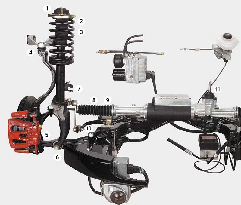 1. Newralgiczne miejsca niezależnego zawieszenia kół przednich i układu kierowniczego (źródło: TRW)
