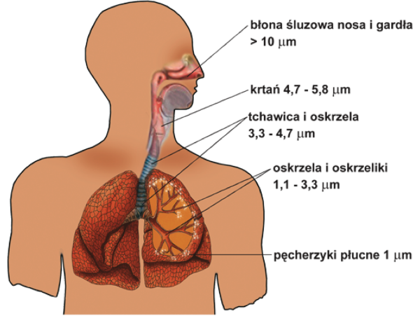 Odpowiadając na to pytanie, warto pamiętać, że – ze względu na skutki zdrowotne – najważniejsze są bardzo małe cząstki frakcji pyłu, co umożliwia im przeniknięcie do obszaru wymiany gazowej. Ten pył nazywa się pyłem respirabilnym i jest on odpowiedzialny za rozwój pylicy płuc, większości nowotworów oraz zapalenia pęcherzyków płucnych. Należy jednak zaznaczyć, że pył nierespirabilny (osadzający się w obrębie górnych dróg oddechowych i w obszarze tchawiczno-oskrzelowym) nie może być traktowany jako obojętna biologicznie część składowa aerozolu. Część nierespirabilna pyłu, upośledzając mechanizm eliminacji pyłu z organizmu w wyniku niszczenia nabłonka migawkowego (przewlekłe nieżyty oskrzeli), powoduje, że wnikanie pyłu do obszaru pęcherzykowego staje się łatwiejsze.