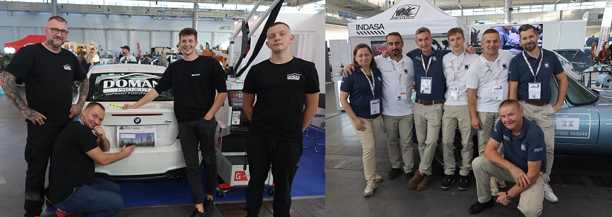 Po lewej firma Herkules, która zaprezentowała m.in. spotter blacharski, który pozwala wyciągnąć wgniecenia w karoserii. Na stoisku, przy współpracy z Doman Project, zaprezentowano wyjątkowy model BMW 1 M, produkowany jedynie przez rok. Po prawej stronie Indasa, która poczas targów zaprezentowała po raz pierwszy nową linię ceramiczną, która sprawdzi się przy renowacji zabytków
